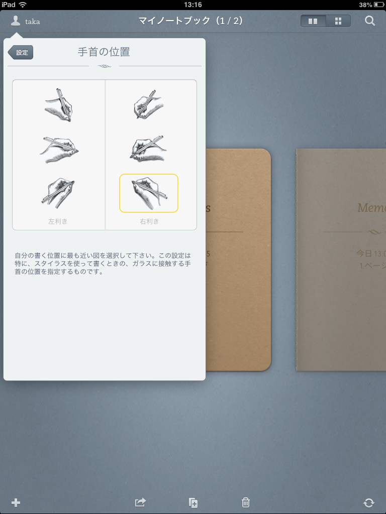 設定画面で利き手やペンを持つスタイルを変更できます。